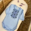 A long-sleeve bodysuit for newborns, designed for maximum comfort. Snap fasteners on the shoulder and between the legs make changing easy and quick. Soft and durable interlock gently touches the skin, breathes well, retains warmth, and keeps its shape even after numerous washes. The chest and sleeve edges are adorned with an exquisite imitation of Ukrainian embroidery, made with high-quality, long-lasting print. The author’s design combines modern style with the beauty of Ukrainian traditions, bringing a special warmth to every detail.