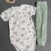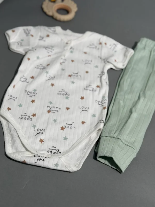 A comfortable and stylish set for babies, designed for everyday comfort and movement. The set includes: • short-sleeved bodysuit • pants Soft knitwear (interlock) gently fits the body, is breathable and gives a feeling of lightness throughout the day. The bodysuit has convenient buttons that allow you to quickly change the baby's clothes, and the pants with elastic elastic fit comfortably and do not constrain movements. An ideal option for walks, home or the first active explorations of the world. The set looks gentle, modern and easily combines with other wardrobe items.