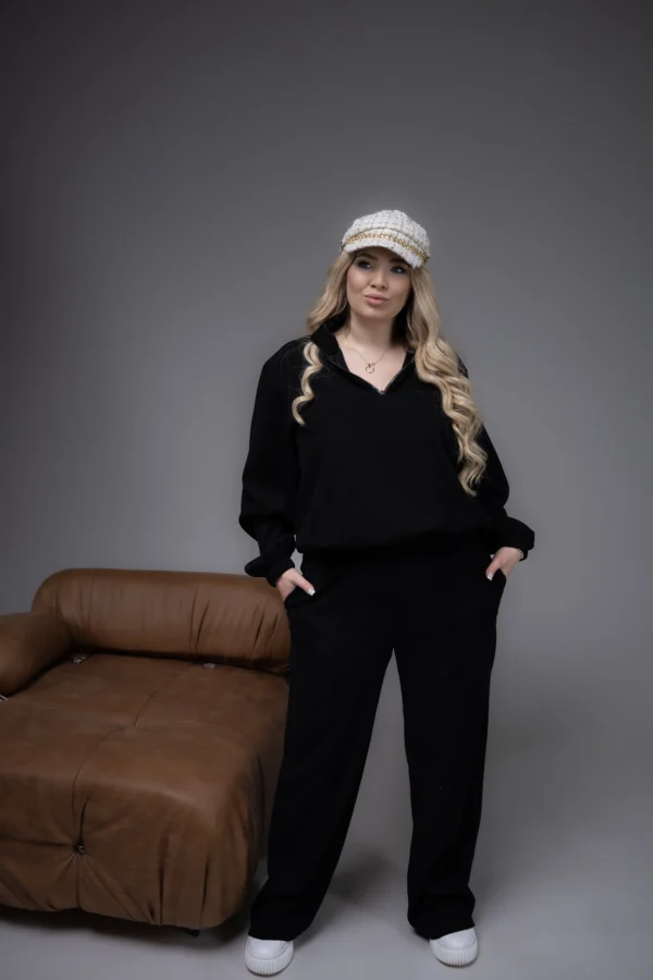 The microvelvet casual set is one of the most popular models in our store! The straight-cut top with elastic cuffs and hem creates a comfortable and stylish silhouette, while the stand-up collar with a zipper halfway down the chest adds a touch of boldness and modernity. Trendy palazzo pants complete the look with lightness and freedom of movement. This versatile set is perfect for walks, meeting friends, or cozy evenings at home. A wide palette of bright and neutral shades lets you choose an option for any style and mood. The perfect blend of comfort and fashion!