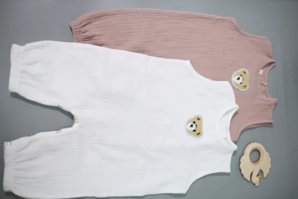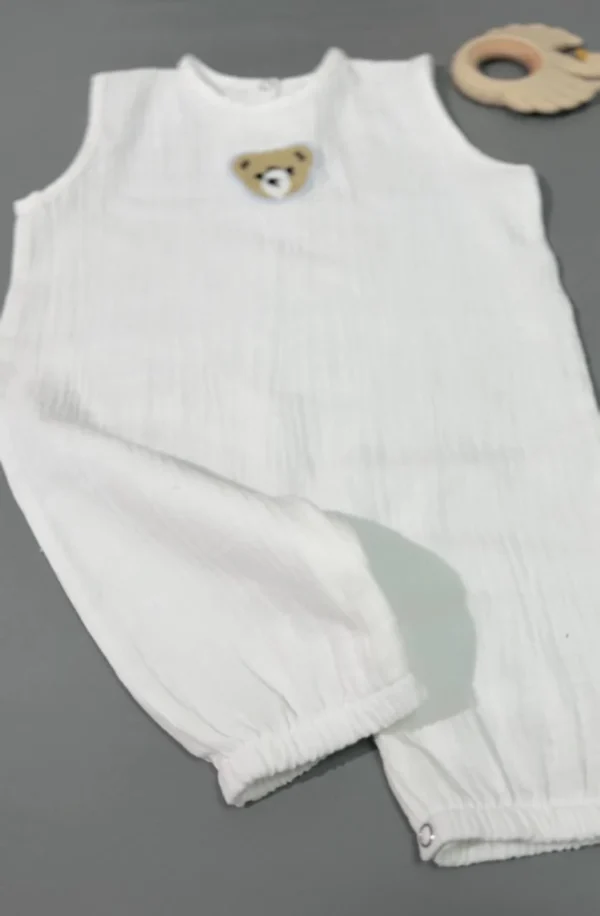 The sandbox is made of natural cotton muslin - a soft and breathable material that provides comfort to the child throughout the day.The loose cut does not restrict movement, and the lack of sleeves makes the model comfortable for an active day and walks in the warm season.The button fasteners make it easy to change the child's clothes. Soft elastic bands on the legs provide a comfortable fit without pressure.Decorated with a neat “Teddy” patch, which adds a delicate accent to the produc