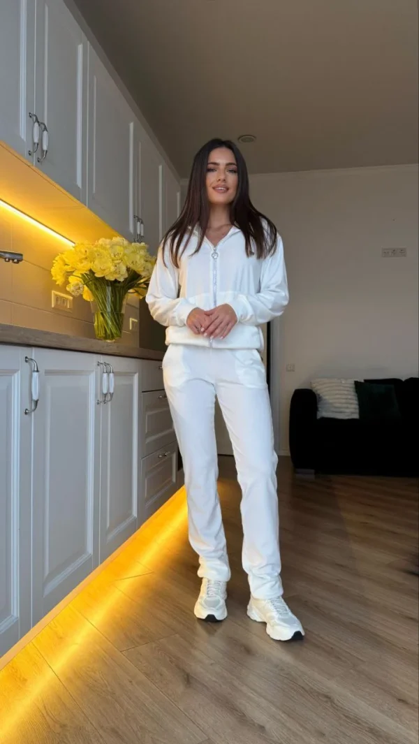 A velour tracksuit is a versatile piece that pairs easily with various wardrobe items. For a casual look, sneakers or trainers are perfect, adding comfort and a sporty touch. If you want a more stylish outfit, Chelsea boots or trendy loafers work great. The velour tracksuit matches well with basic T-shirts, fitted turtlenecks, or hoodies. Minimalist jewelry and a small bag or backpack make ideal accessories. This outfit is perfect for walks, trips, and everyday wear.