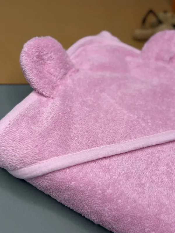 The pink 80×80 terry towel with a hood and cute ears is designed for comfortable newborn bathing. Made of natural terry (100% cotton), it absorbs moisture well, dries quickly, and is gentle on delicate skin. The reinforced edging ensures durability, while the hood keeps the baby warm after the bath. Soft, cozy, and easy to handle, this towel is especially convenient for mothers during daily baby care.