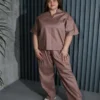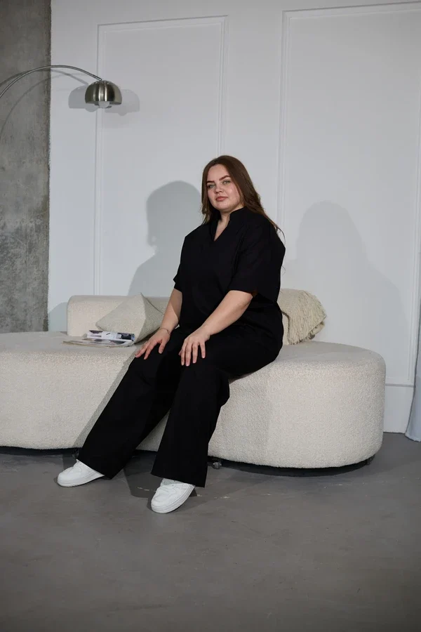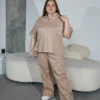 The summer linen pantsuit for plus size women combines high-quality material with impeccable tailoring. The straight-cut blouse with a neat hem and a stand-up collar creates an elegant and modern look. The pants are straight and wide, providing comfort and freedom of movement. This suit is perfect for the office and business meetings, and it easily transforms into a stylish outfit for evening walks and celebrations with the help of trendy accessories. The pant length pairs perfectly with heeled shoes, accentuating femininity.
