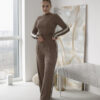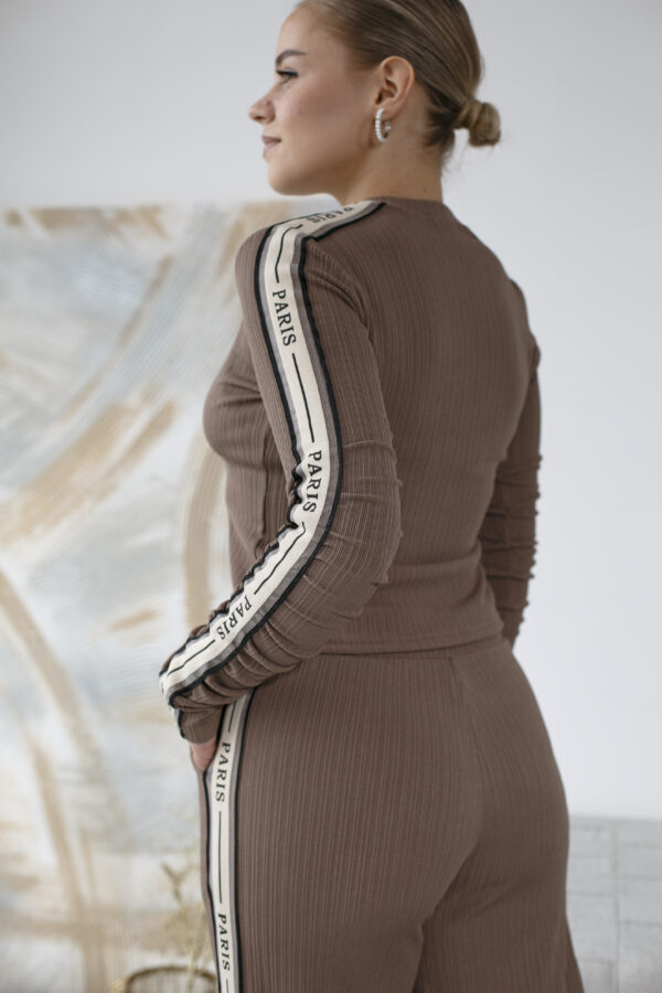 The sports suit made of crepe-rib fabric is the choice for those who love to stand out and value comfort. This set undoubtedly attracts attention thanks to its stylish design and modern details. Contrasting tape with striking inscriptions runs along the sides of the sweatshirt and pants, adding a bright accent and dynamic vibe to the look. The comfortable pants perfectly emphasize a slim figure, creating a harmonious silhouette. The perfect combination of fashion, style, and affordable price makes this suit an excellent choice for active and stylish individuals.