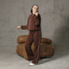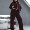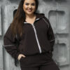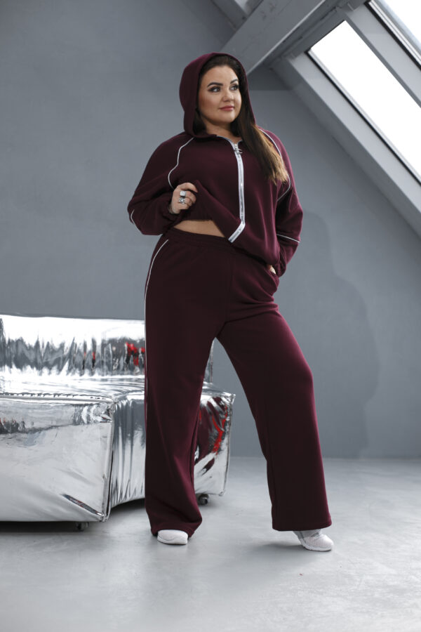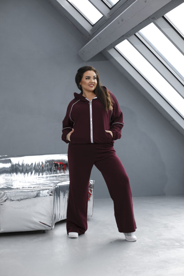The women's casual suit with a contrasting insert is an excellent choice for the cold season. Made from dense double-knit fabric, the material holds its shape well and retains warmth. The zip-up jacket with convenient pockets and a stand-up collar adds neatness and style to the look. The straight palazzo pants accentuate the figure and visually elongate the silhouette. A bright feature of the set is the contrasting inserts on the sleeves and pants — vertical lines slim the figure and create a dynamic appearance. The suit is versatile, matching any footwear and suitable for any outdoor activity.