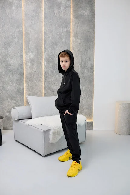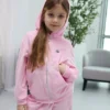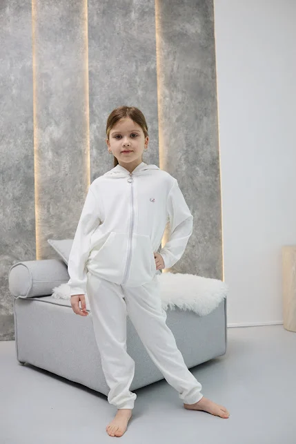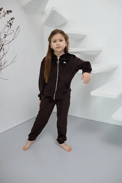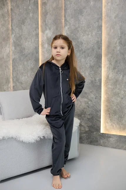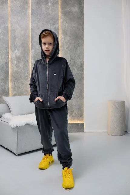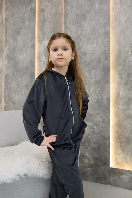 Дитячий велюровий спортивний костюм - це м'який, зручний та стильний комплект для прогулянок, школи чи будинку. Зазвичай включає кофту на блискавці з капюшоном та штани з манжетами. Велюр добре зберігає тепло, приємний до тіла, не втрачає форму при правильному догляді.