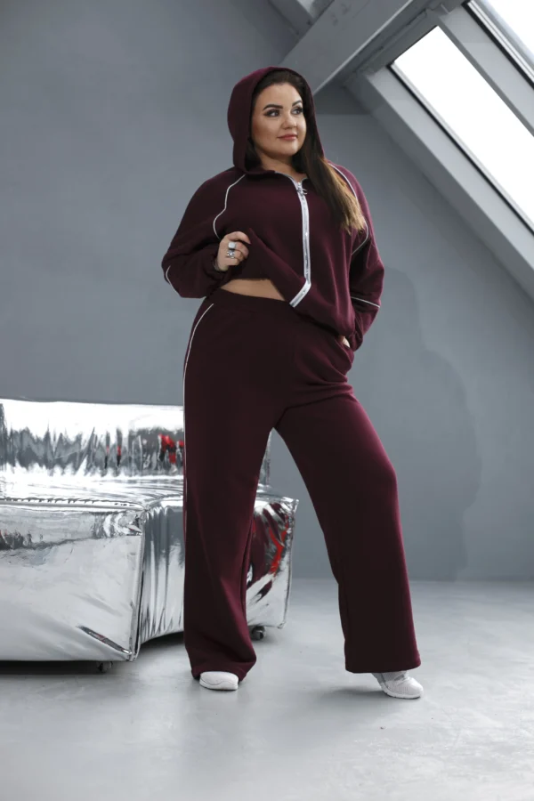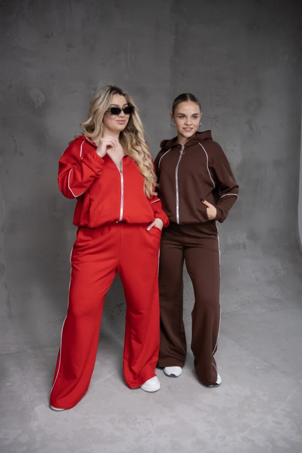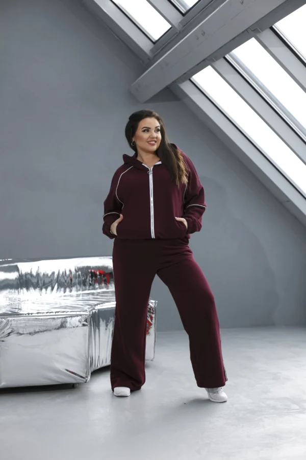 Жіночий прогулянковий костюм із контрастною вставкою — відмінний вибір для холодного часу року. Виконаний із щільної двонітки, матеріал добре тримає форму та зберігає тепло. Кофта на блискавці з зручними кишенями та коміром-стійкою додає образу акуратності та стилю. Прямі брюки палаццо підкреслюють фігуру та візуально витягують силует. Яскравою особливістю комплекту стали контрастні вставки на рукавах і штанах — вертикальні лінії стрункішують і роблять образ динамічним. Костюм універсальний: пасує до будь-якого взуття та для будь-якого виду відпочинку на свіжому повітрі.