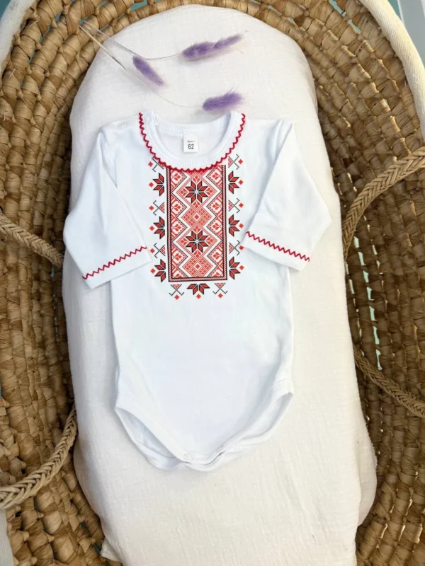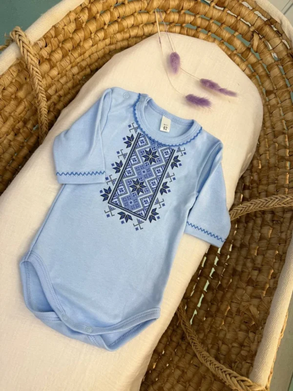 Бодік для новонароджених з довгим рукавом створений для максимального комфорту малюка. Застібки з кнопками на плечі та між ніжками роблять перевдягання простим і швидким. М’який та міцний інтерлок дбайливо торкається шкіри, добре дихає, зберігає тепло та форму навіть після численних прань. Оздоблення на грудях і по краю рукавів — вишукана імітація української вишивки, виконана якісним і стійким накатом. Авторський дизайн поєднує сучасний стиль і красу українських традицій, створюючи особливе тепло в кожному елементі.