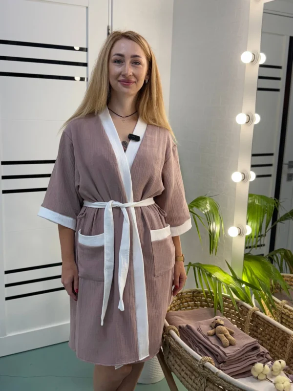 Натуральний мусліновий халат — ідеальний вибір для матусь та в пологовий. Легкий, дихаючий, гіпоалергенний, зручний у догляді. Дарує комфорт щодня та ніжність у важливі моменти життя.