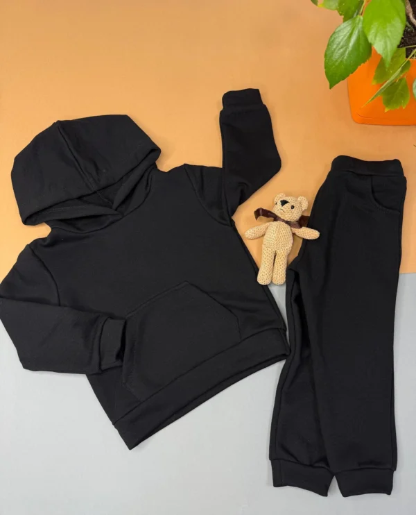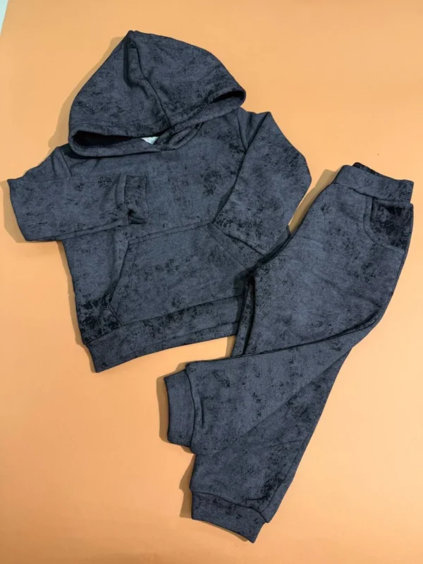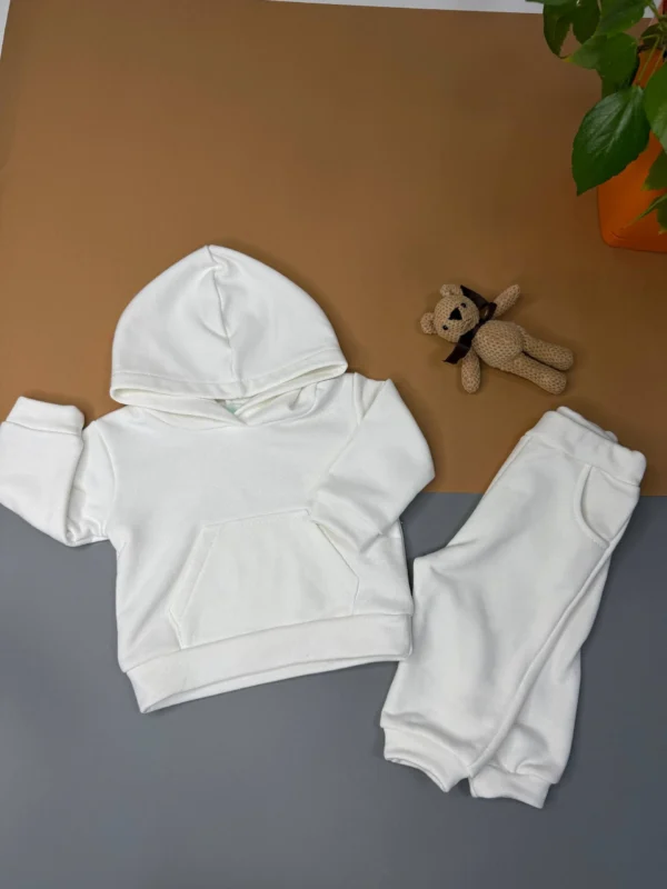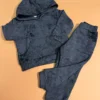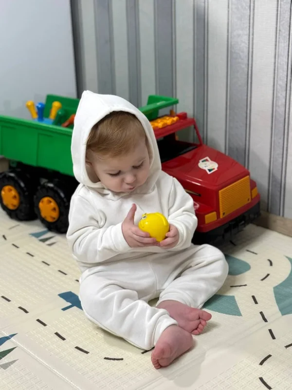 Костюм із петлистого трикотажа, виготовлений зі 100% натуральної бавовни з петлевою текстурою. Це зручний спортивний комплект, який поєднує практичність і стиль. Кофта з капюшоном і місткою кишенею-кенгуру дарує комфорт та захист у прохолодну погоду. Штани з бічними кишенями та манжетами на ніжках створюють зручну посадку і не сковують рухів. Манжети на рукавах також додають комфорту та утримують тепло. Натуральна тканина приємна до тіла, дихає й підходить для щоденного носіння. Ідеальний варіант для прогулянок, ігор і повсякденного гардеробу малюка.