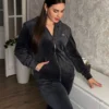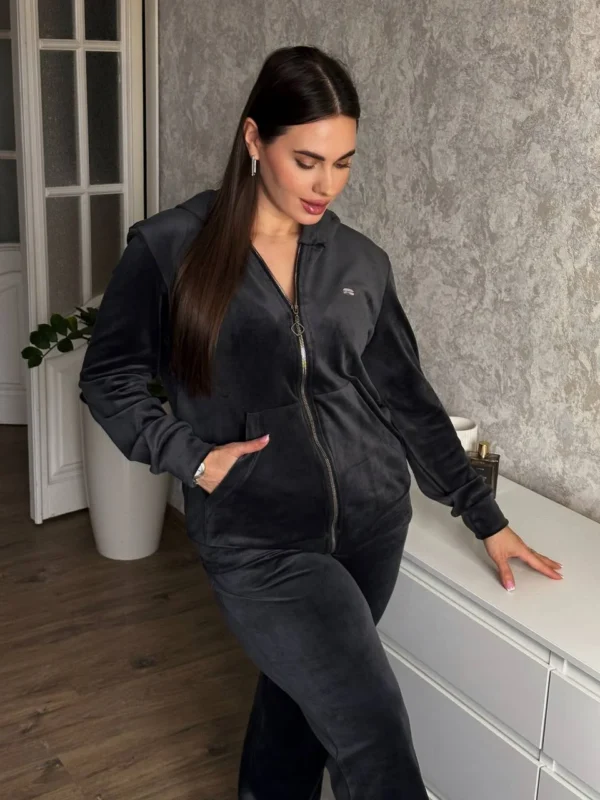 Велюровий костюм - це комплект одягу, що складається з куртки (кофти) і штанів, зшитий з велюрової тканини з м'яким, оксамитовим ворсом на лицьовій стороні. Це комфортний і практичний вибір для повсякденного носіння, що відрізняється приємною текстурою, гарною повітропроникністю та стійкістю до зносу.