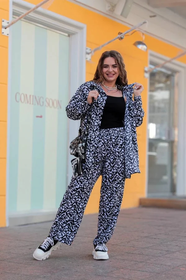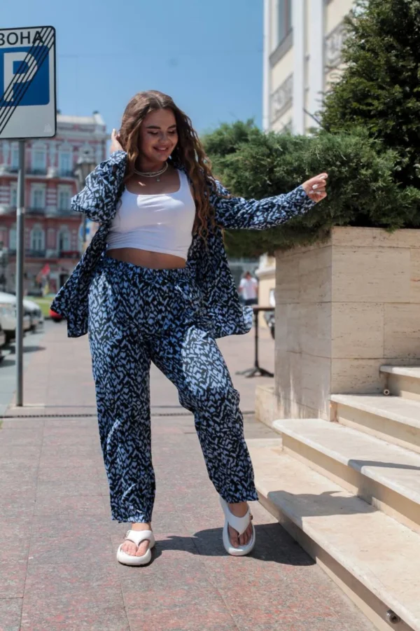 Літній жіночий костюм із найтоншого софту — справжній must-have вашого гардероба! Вільна сорочка з боковими розрізами створює легкий та повітряний образ, ідеально підходящий для спекотних днів. Штани прямого крою на резинці додають розслабленості та романтики вашому стилю. Сорочка з довгим рукавом стане незамінною у прохолодні літні вечори. Смiливі контрастні принти підкреслять вашу індивідуальність, а великий розмір дозволить пишним красуням обрати ідеальний комплект за смаком. Комфорт і стиль в одному наборі!