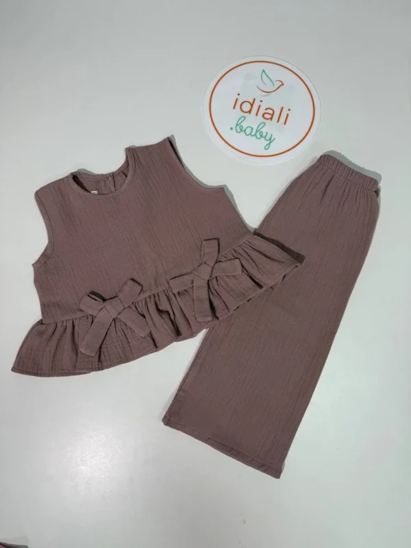 Костюм выполнен из натурального хлопкового муслина – мягкого и дышащего материала, который обеспечивает комфорт ребенку в течение дня. Комплект состоит из топа с рюшем и декоративными бантиками и свободных брюк на резинке. Такой крой не ограничивает движения и подходит для активного дня, прогулок и отдыха. Лаконичный дизайн с акцентом на бантики придает образу нежности и делает костюм стильным вариантом для повседневного гардероба.