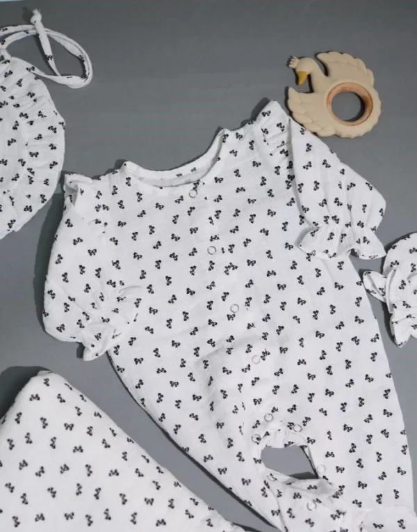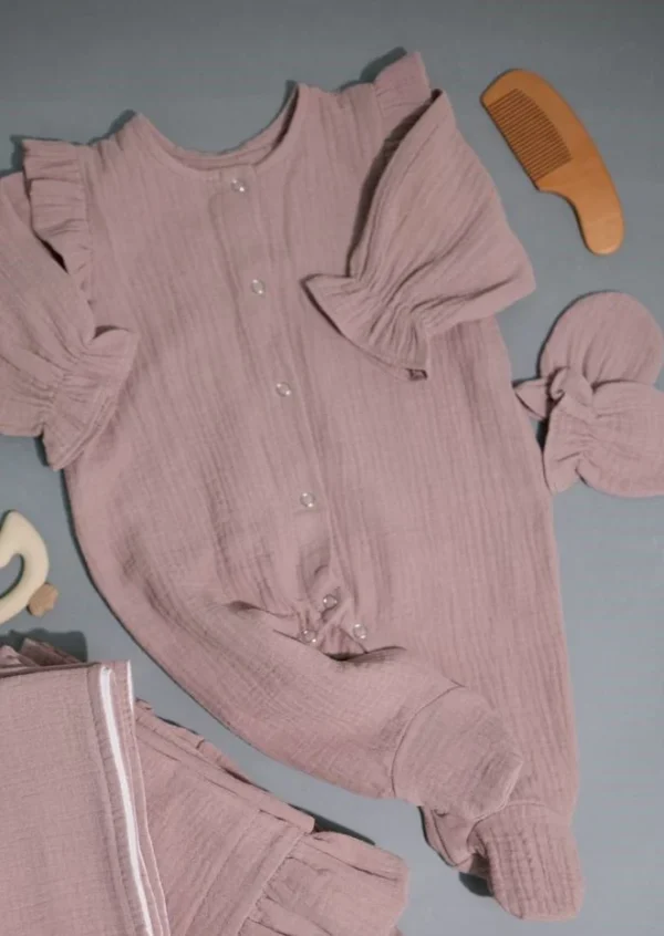 Муслиновый комбинезон создан для комфорта новорожденного с первых дней жизни. Натуральная хлопковая ткань дышит, не перегревает и подходит для чувствительной кожи.Удобная конструкция с пуговицами позволяет быстро переодевать малыша без лишнего дискомфорта. Мягкие манжеты и продуманный крой обеспечивают комфортную посадку и свободу движений.В комплект входят шапочка и перчатки, что делает изделие готовым решением для родильного дома или первого гардероба ребенка.