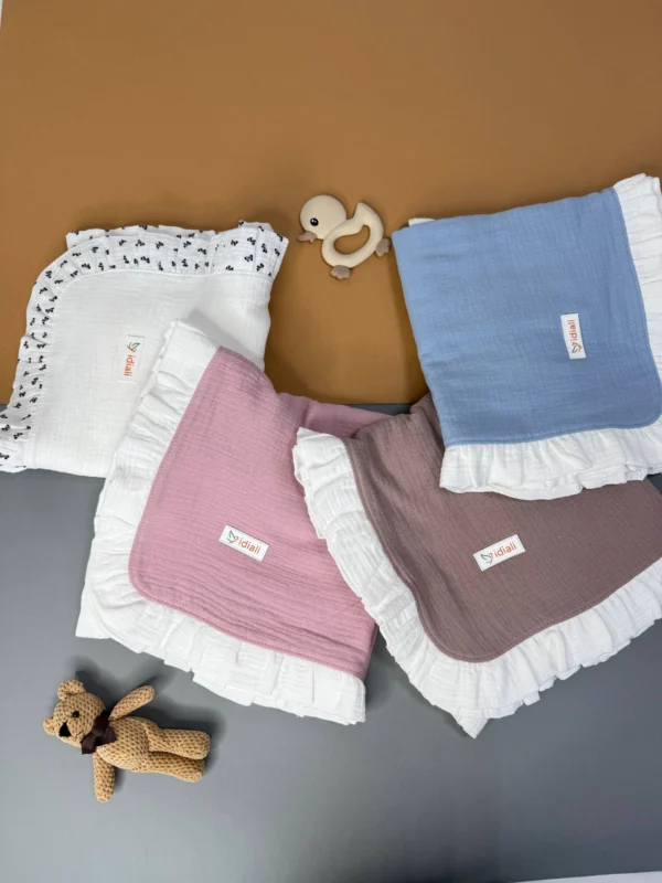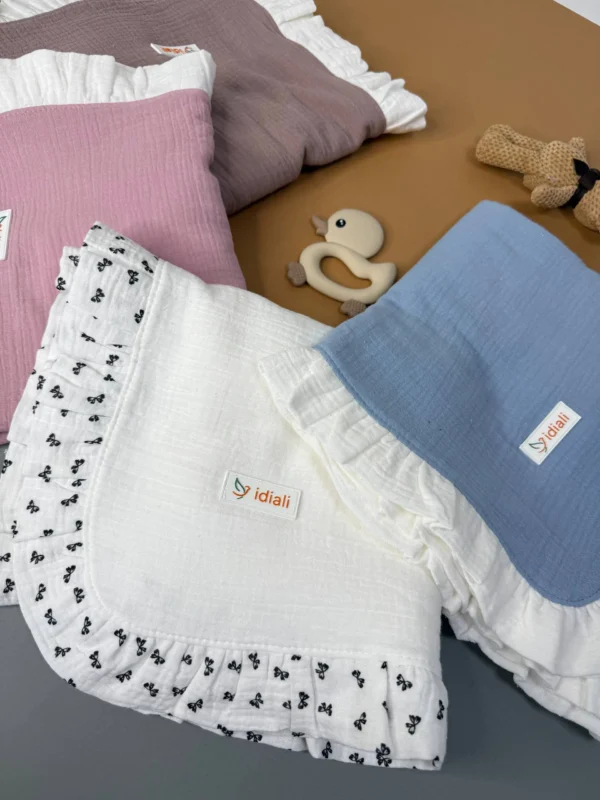 Нежное детское покрывало из натурального муслина с рюшами – лёгкое, дышащее и гипоаллергенное. Легко стирается, быстро сохнет. Идеально для комфорта малыша и спокойствия мамы.