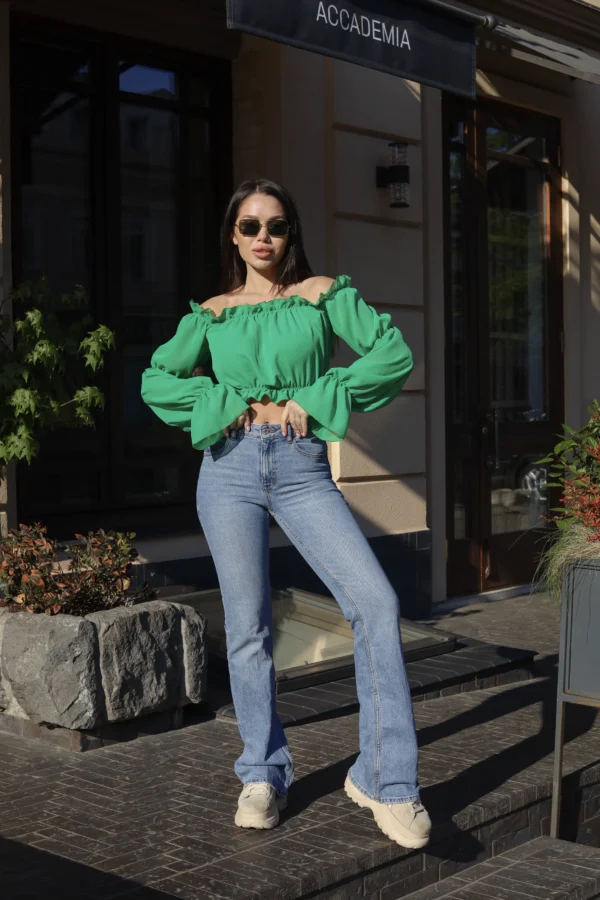 Укороченная блуза топ из невесомого шифона это настоящий must have в гардеробе модной молодежи. Смелый крой с открытыми плечами придает образу дерзости и легкого флирта. Длинные рукава фонарики создают объем и смотрятся действительно эффектно. Такая модель идеально сочетается с джинсами с высокой посадкой мини юбками или брюками карго создавая стильный баланс открытости и сдержанности. Молодежь выбирает ее для прогулок вечеринок фестивалей или создания модного контента в социальных сетях. Добавь массивные серьги очки или кроссовки и твой образ точно привлечет внимание.