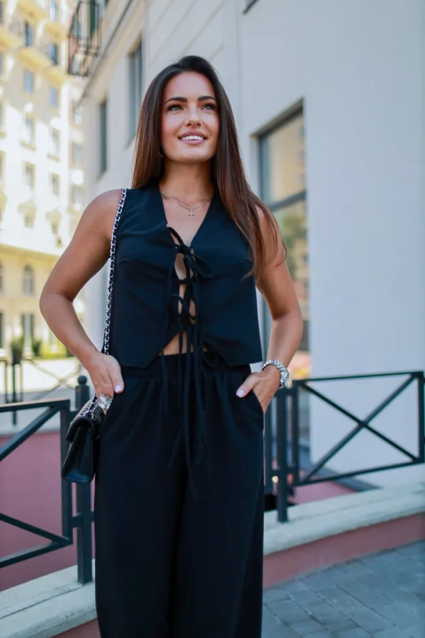 Неповторимый дизайн костюма с укороченной желеткой и брюками палаццо — идеальный выбор для летних модниц. Лен — фаворит сезона, ведь он дышит, не жарит и дарит естественную свежесть. Маленькая желетка с игривыми завязками легко становится звездой образа или стильным слоем для многослойности. Брюки палаццо в тренде — свободные, стильные и подчеркивающие индивидуальность. Сочетай с простыми топами, кроссовками или босоножками. Идеально для прогулок, встреч с друзьями и городских приключений.